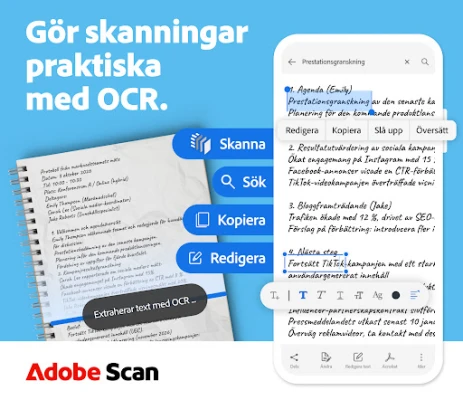 Oavsett om det är kvitton, ID-kort, handskrivna anteckningar, recept, visitkort eller whiteboardtavlor, digitaliserar Adobe Scan allt med enastående klarhet. Appens unika teknologi upptäcker inte bara kanter och förbättrar läsbarheten; den omvandlar även text i dina bilder till sökbar och redigerbar information. Detta innebär att du enkelt kan hitta specifika ord i skannade dokument eller kopiera och återanvända text, vilket sparar dig värdefull tid.