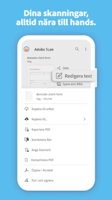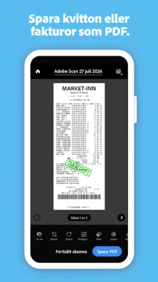 Dina digitala mästerverk sparas automatiskt i Adobe Document Cloud, vilket garanterar säker åtkomst och enkel delning över alla dina enheter. Återanvänd innehåll genom att exportera dina skanningar till populära format som Word, Excel och PowerPoint, eller öppna dem direkt i Acrobat Reader för att enkelt kommentera, fylla i och signera dokument. För den som behöver ännu mer kraft erbjuder Adobe Scan utökade funktioner via prenumerationer, inklusive möjligheten att kombinera flera skanningar till en enda fil och förbättrad OCR-kapacitet för större dokument. Upptäck hur Adobe Scan förvandlar din enhet till det ultimata verktyget för dokumenthantering.