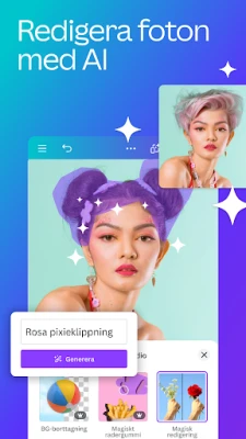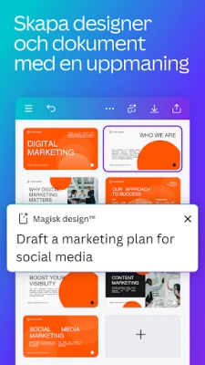 Släpp loss den inbyggda AI Magic som omdefinierar kreativa gränser. Med Magic Design laddar du upp en bild och låter Canvas intelligenta system generera unika konstverk. Magic Edit låter dig sömlöst byta ut eller lägga till element i dina foton, medan Magic Eraser enkelt trollar bort oönskade objekt. Bygg ditt varumärke med Canvas verktyg för logotyper och banners, skräddarsy CV:n med professionella mallar, och visualisera data med infografik och presentationer. Allt detta kompletteras av Canvas omfattande gratiskatalog med miljontals bilder, videor utan vattenstämplar, licensierade ljudspår och hundratals typsnitt. Dessutom kan du skapa helt nya bilder med AI-verktyget "Text till bild".