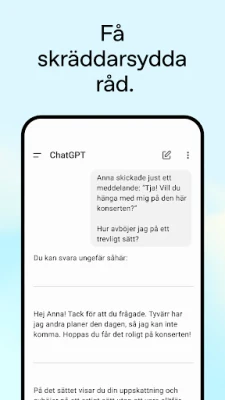 Oavsett dina behov erbjuder ChatGPT skräddarsydda lösningar. Behöver du inspiration? Generera presentidéer eller skapa ett personligt grattiskort som verkligen sticker ut. Få skräddarsydda råd för att formulera genomtänkta svar eller hitta innovativa lösningar på komplexa utmaningar. För individanpassad utbildning kan appen förklara hur elektricitet fungerar för ett dinosaurieälskande barn eller fräscha upp dina egna kunskaper om en historisk händelse. På arbetsplatsen fungerar ChatGPT som en utmärkt partner för nya idéer, oavsett om det handlar om att brainstorma marknadsföringstexter eller utveckla en affärsplan. Dessutom får du svar direkt, som förslag på recept baserade på de få ingredienser du har hemma.