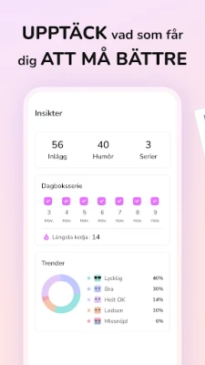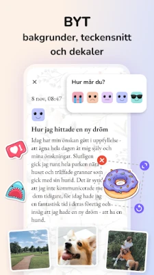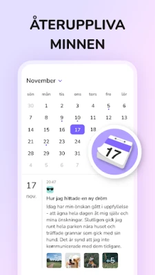 Förhöj dina dagboksinlägg genom att integrera foton, vilket förvandlar dina anteckningar till levande minnesberättelser. Mer än bara text, blir dina sidor nu en rik samling av både ord och bilder som fångar ögonblickets essens. Använd den inbyggda humördagboken för att noggrant registrera dina känslor och stämningslägen dagligen. Med tiden kommer du att upptäcka mönster och få värdefulla insikter om vad som påverkar ditt välbefinnande, vilket banar väg för större självkännedom. Genom kalendervyn kan du enkelt navigera tillbaka i tiden för att återuppleva speciella dagar och reflektera över din resa.