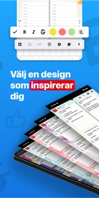 Skräddarsy din planeringsmiljö för att matcha din stil med en mängd bakgrundsteman och få full kontroll över textens utseende – ändra färg, storlek, markera med fetstil, kursiv, understrykning eller genomstrykning för att prioritera och tydligt markera slutförda uppgifter. För de tankar eller listor som inte är kopplade till ett specifikt datum finns en dedikerad anteckningssida, perfekt för inköpslistor eller spontana idéer. Vidare erbjuder **Dagbok, kalender, organizer, planner** funktioner som veckonummer, anpassning av veckans startdag, flera språkval, en förstorad dagsvy, möjlighet att dela upp dagen i timintervall för noggrann schemaläggning samt en kraftfull sökfunktion. Hantera återkommande evenemang med lätthet, ställ in automatiska påminnelser, och dra nytta av smidig synkronisering via iCloud och externa kalendrar som GoogleCalendar och iPhoneCalendar.