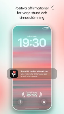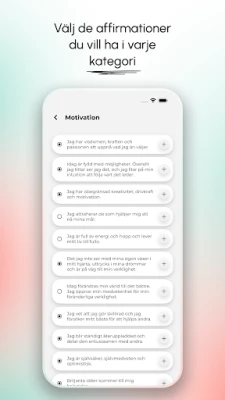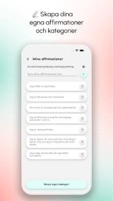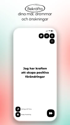 För att ytterligare förhöja din upplevelse kan du anpassa bakgrunder och låta dig omfamnas av lugnande bakgrundsmusik, perfekt för avkoppling och mental återhämtning. Spegel av dagliga affirmationer håller dig inspirerad med dagliga påminnelser och ger dig även den unika möjligheten att skräddarsy och spara dina egna personliga affirmationer i egna kategorier. Genom att integrera Spegel av dagliga affirmationer i din vardag, får du ett kraftfullt stöd för att höja din motivation och självkänsla, stärka din mentala motståndskraft och upprätthålla en livsstil präglad av positivitet och medveten egenvård. Upplev skillnaden i ditt tankesätt redan idag.