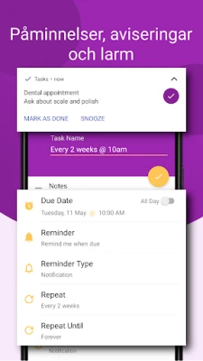 Glöm bort att missa deadlines eller viktiga händelser. Med Uppgifters smarta påminnelser levereras dina to-dos precis när de behövs, direkt till din enhet. Tack vare handlingsbara meddelanden kan du enkelt hantera dina uppgifter utan att ens öppna appen – markera som slutförd eller snooza för senare med ett enkelt tryck. Uppgifter är i ständig utveckling, driven av användarnas feedback. Din röst är viktig för att forma appens framtid; vi välkomnar aktivt förslag för att göra Uppgifter ännu bättre och mer anpassad efter dina behov.