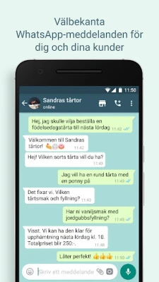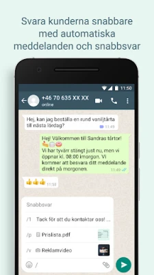 Maximera din effektivitet och hantera kunddialoger med oöverträffad precision. WhatsApp Business låter dig spara värdefull tid genom att automatisera rutinuppgifter: skicka snabba svar på vanliga frågor och meddela kunder om din tillgänglighet med smarta frånvaromeddelanden. Organisera enkelt dina konversationer med anpassningsbara etiketter för snabb åtkomst och översikt. Du kan även dela tidsbegränsade erbjudanden, nyheter eller uppdateringar via Statusfunktionen, samt smidigt hantera beställningar och ta emot betalningar direkt i appen där funktionaliteten är tillgänglig, vilket lyfter kundupplevelsen till nya höjder.